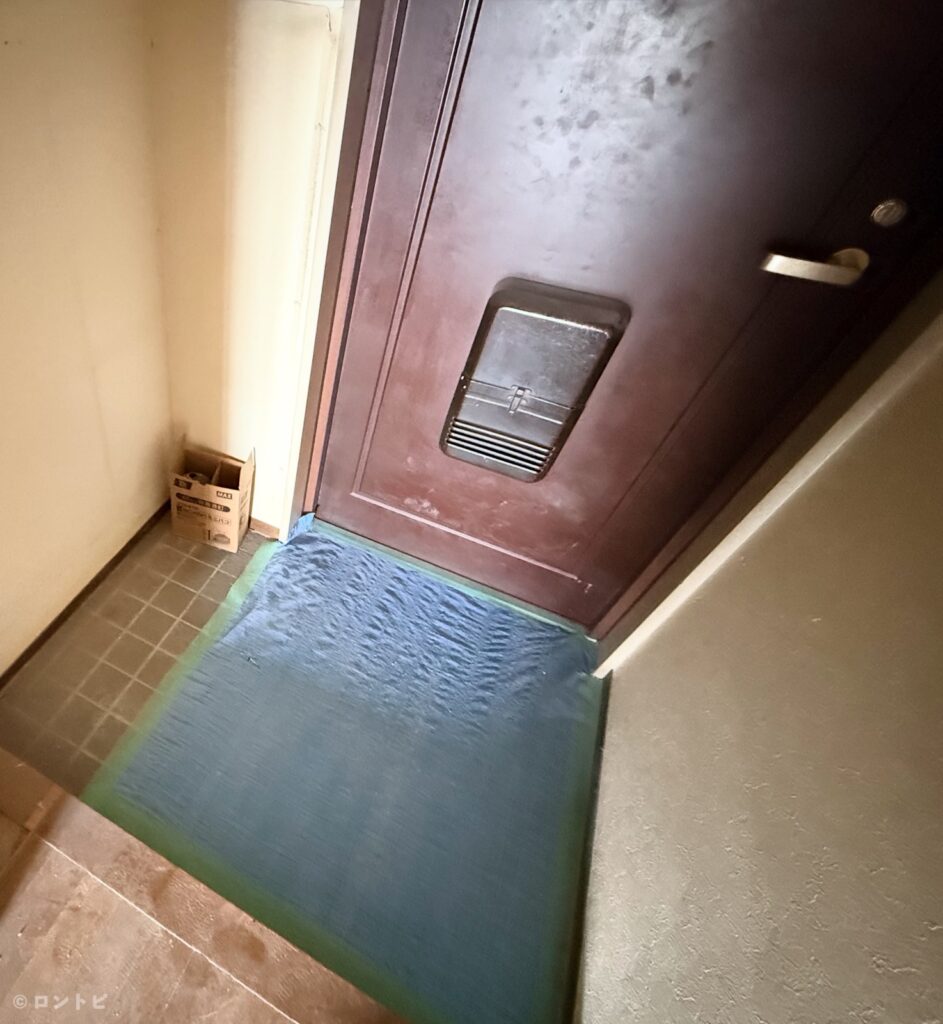 次の画像は工事中の玄関ですが、少しだけ写っているドアには錆びて傷だらけの郵便受けが見えます。